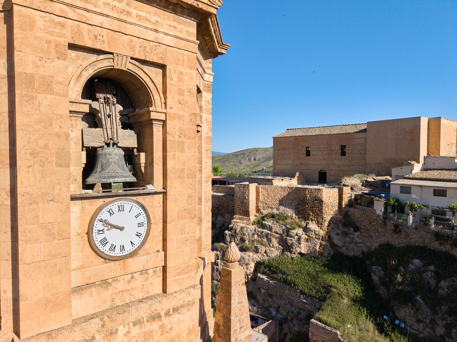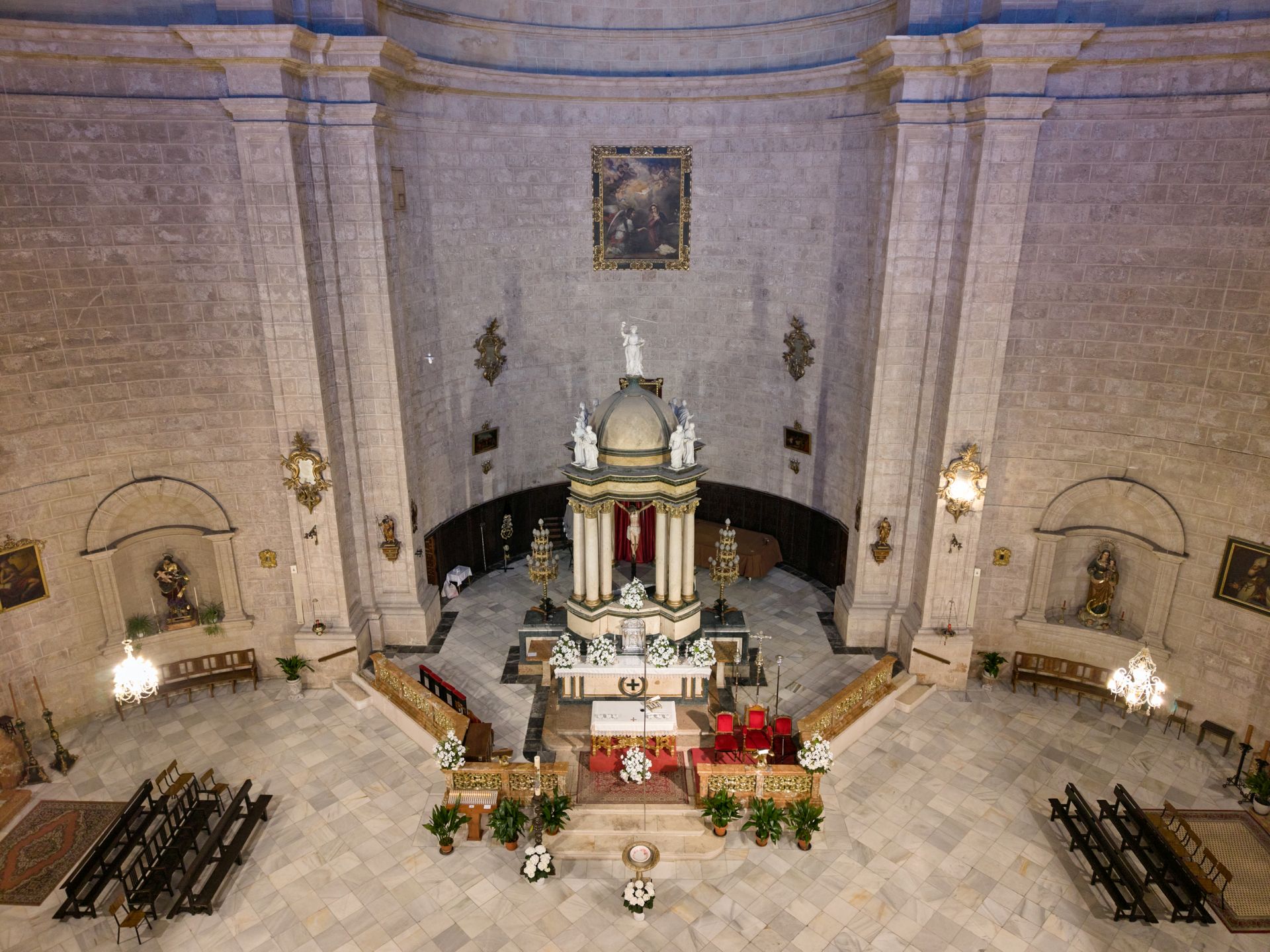 El resultado es un crucero cuadrado cubierto con bóveda al que se abren tres grandes exedras —semicirculares las laterales y poligonal la central—, todas ellas cubiertas con bóvedas de cuarto de esfera que demuestran el dominio técnico de la cantería dieciochesca. Corona el conjunto una imponente torre octogonal de campanario que se remata con cornisa cuadrada, frontones triangulares en los lados mayores y cúpula con linterna, configurando una silueta inconfundible que domina el ‘skyline’ lojeño y actúa como faro visual para toda la comarca.