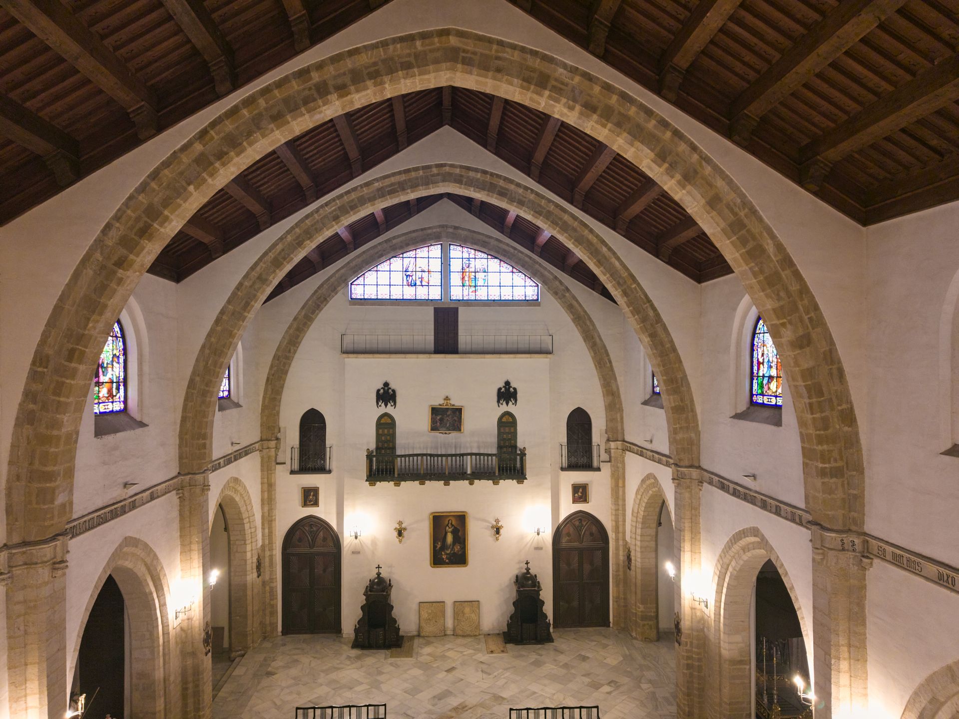 La nave gótico-mudéjar original, recientemente restaurada, se articula mediante arcos transversales que sustentan una espléndida armadura mudéjar, mientras que las capillas laterales se abren al espacio central a través de arcos apuntados cubiertos con bóvedas de crucería estrellada, sobre las cuales se disponen ventanas con vidrieras que tamizán la luz creando una atmósfera de profundo recogimiento espiritual.